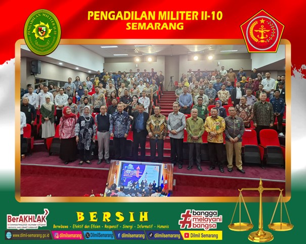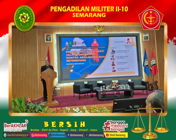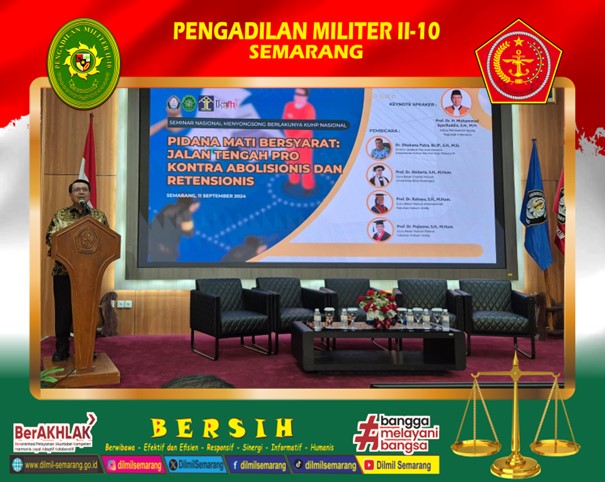 Semarang - Kadilmil II-10 Semarang Kolonel Chk Yudi Pranoto A, S.H. menghadiri Seminar Nasional Menyongsong Berlakunya KUHP Nasional Pidana Mati Bersyarat: Jalan Tengah Pro Kontra Abolisionis dan Rentensionis. Acara diselenggarakan di Universitas Diponegoro Semarang pada tanggal 11 September 2024 dengan Keynote Speaker Ketua MA RI YM. Dr. H.M. Syarifuddin, S.H., M.H.