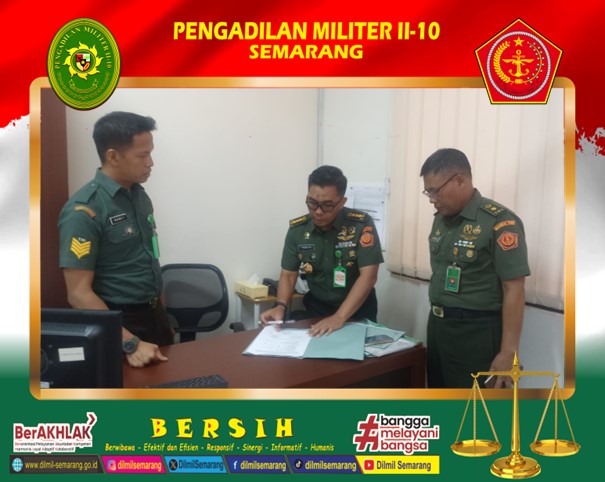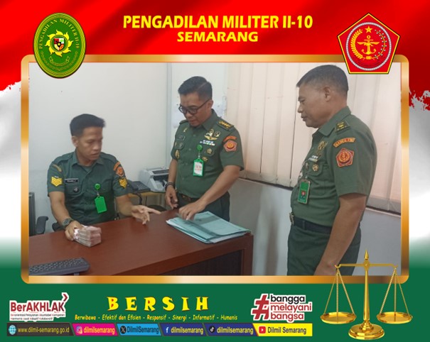 Semarang - Pemeriksaan oleh Kadilmil II-10 Semarang Kolonel Chk Kolonel Chk Yudi Pranoto Atmojo, S.H. terkait pertanggungjawaban pelaksanaan anggaran pendapatan dan belanja negara. Pemeriksaan Kadilmil tersebut sesuai Peraturan Mahkamah Agung RI No. 8 Tahun 2016 tentang Pengawasan dan Pembinaan Atasan Langsung di Mahkamah Agung dan Badan Peradilan Dibawahnya.