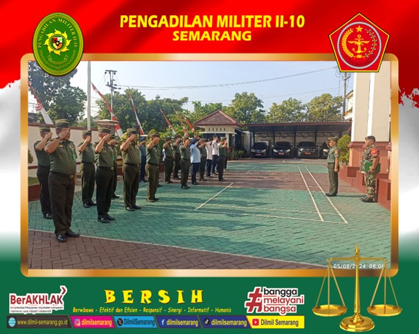 Semarang - Apel pagi, Senin, 5 Agustus 2024 diambil oleh Kadilmil II-10 Semarang, Kolonel Chk Yudi Pranoto Atmojo, S.H. Dalam pengarahannya, Kadilmil mengucapkan terima kasih atas kinerja dan kerjasama anggota yang sudah baik, dan mengingatkan anggota untuk menjaga kesehatan, meningkatkan kedisplinan dan kinerja, serta senantiasa Kadilmil selalu mengingatkan anggota Pengadilan Militer II-10 Semarang untuk menghindari dan menjauhi NARKOBA & KORUPSI serta JUDI ONLINE. Selamat bekerja. Tetap semangat.