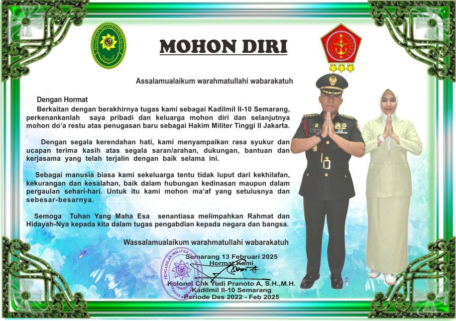 Berkaitan dengan berakhirnya tugas kami sebagai Kadilmil II-10 Semarang, perkenankanlah saya pribadi dan keluarga mohon diri dan selanjutnya mohon do'a restu atas penugasan baru sebagai Hakim Militer Tinggi II Jakarta.