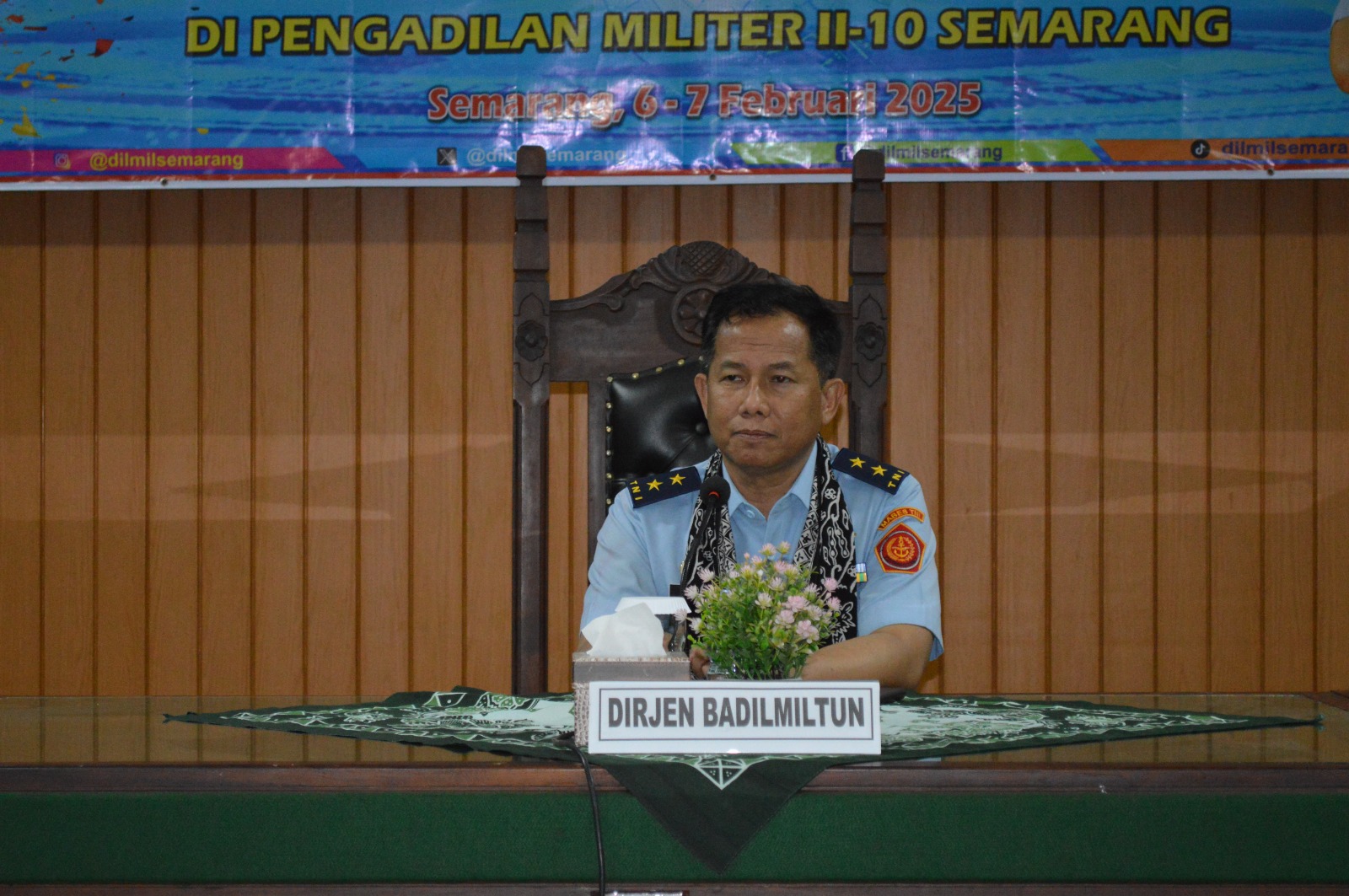 Semarang - Direktur Badilmiltun MA RI Marsekal Muda TNI Dr. Agung Yuwono Nugroho, S.H., M.H. beserta tim melaksanakan Pembinaan di Pengadilan Militer II-10 Semarang yang diterima langsung oleh Kadilmil II-10 Semarang Kolonel Chk Yudi Pranoto A, S.H., M.H. beserta staf. Sebagai bentuk ucapan selamat datang, Kadilmil II-10 Semarang mengalungkan selendang kepada Direktur Badilmiltun MA RI dilanjutkan dengan Office Tour yang langsung dipandu oleh Kadilmil II-10 Semarang. Pada saat Pembinaan, Direktur Badilmiltun MA RI memberikan penekanan, yaitu