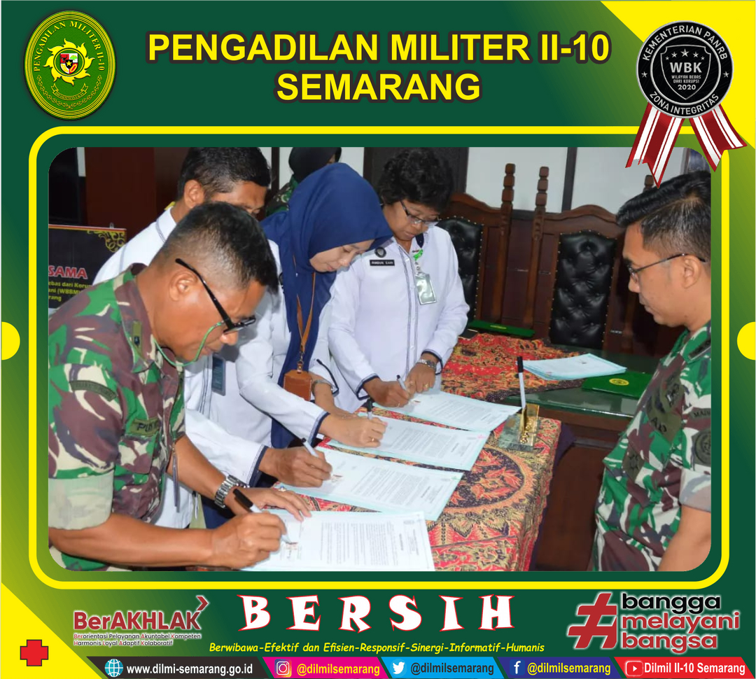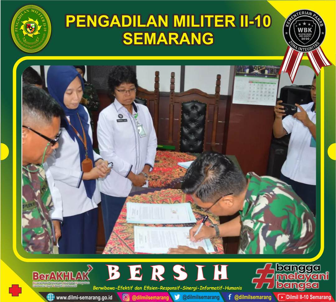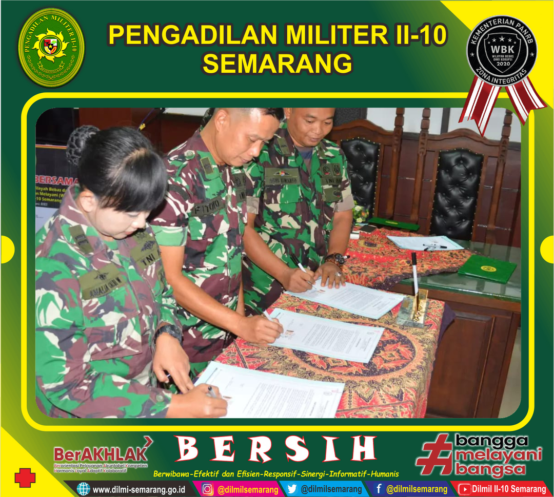 Semarang - Rangkaian kegiatan selanjutnya Penandatanganan Perjanjian Kinerja Tahun Anggaran 2023 antara Kadilmil II-10 Semarang Letkol Chk Yudi Pranoto Atmojo, S.H. dan pejabat struktural serta seluruh staf Pengadilan Militer II-10 Semarang yang berisi tentang perjanjian dalam mewujudkan target Kinerja Tahunan dengan supervisi dari Kadilmil.