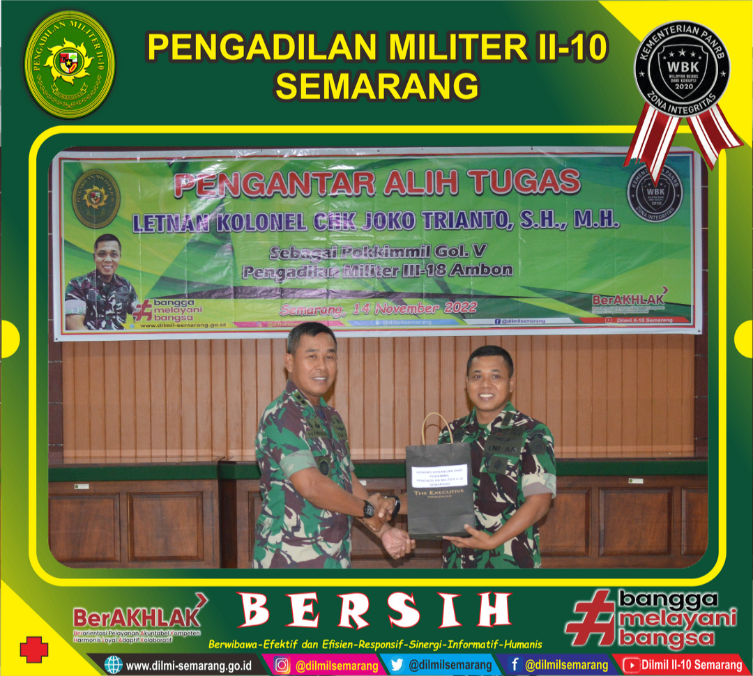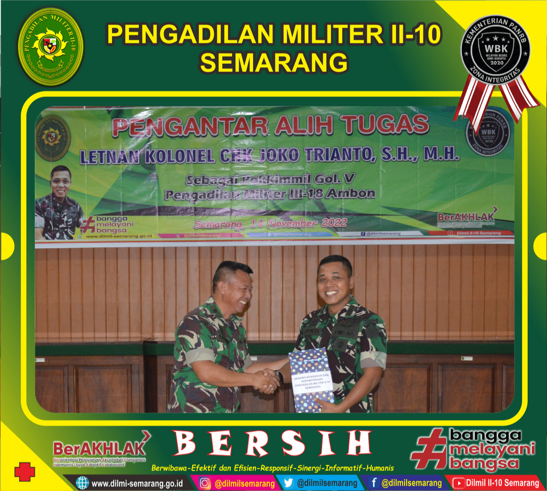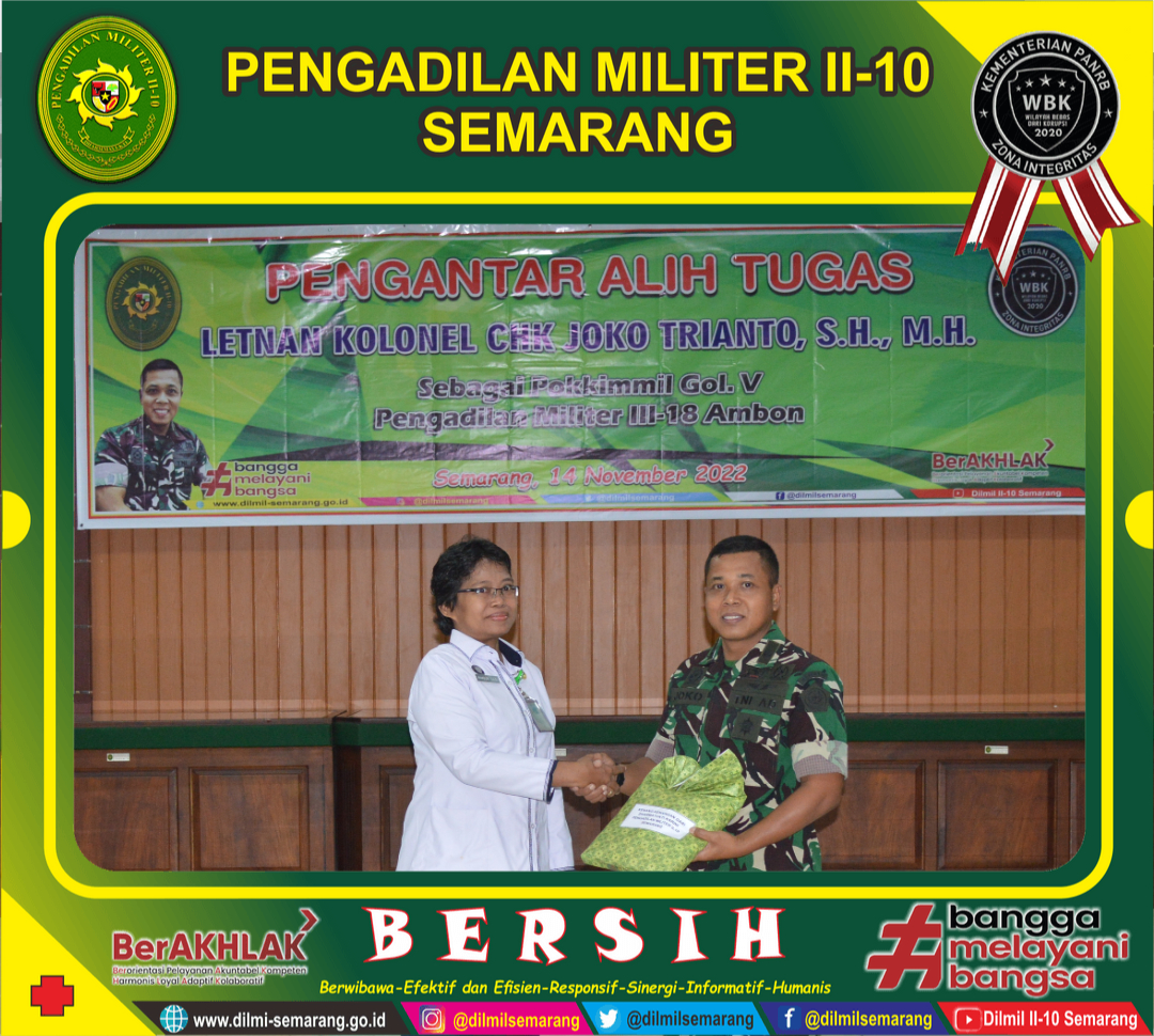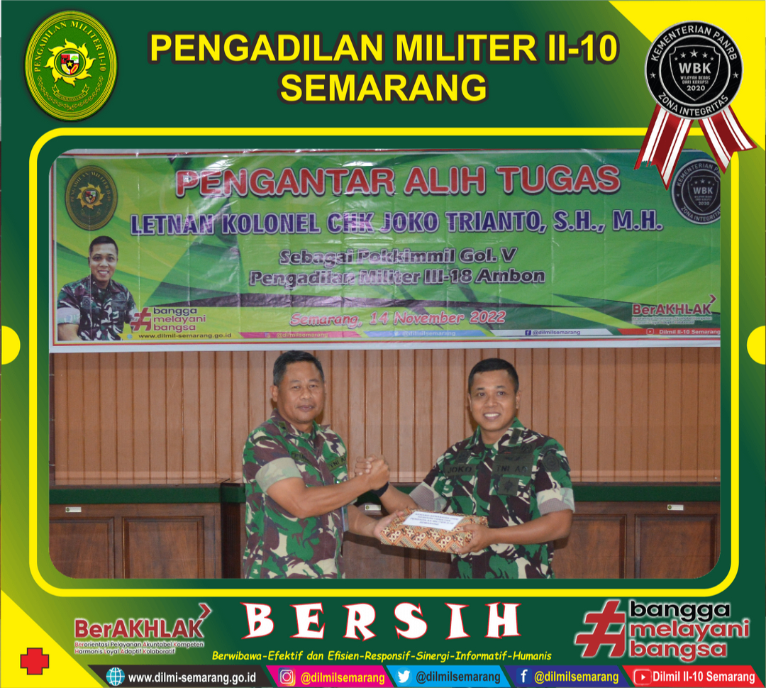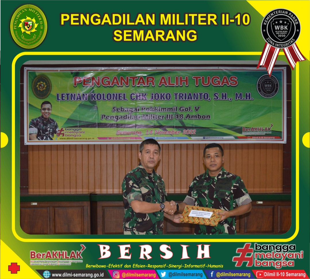 Semarang - Kadilmil Kolonel Sus Wahyupi, S.H., M.H. beserta seluruh personil mengantar Letkol Chk Joko Trianto, S.H., M.H. yang beralih tugas ke Dilmil Ambon.
