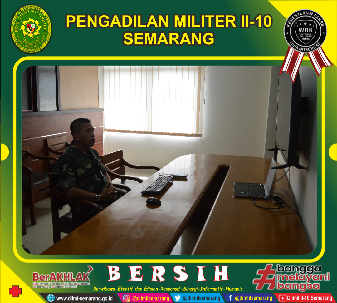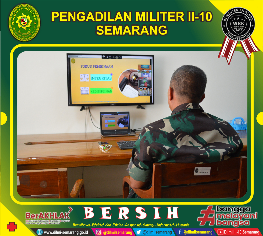 Semarang - Kadilmil Kolonel Sus Wahyupi, S.H., M.H. mengikuti pengarahan tentang Pakta Integritas dan Pengucapan Pakta Integritas di jajaran Pengadilan Militer Tinggi II Jakarta yang dipimpin oleh Kadilmilti II Jakarta Brigadir Jendral TNI Faridah Faisal, S.H., M.H. secara daring.