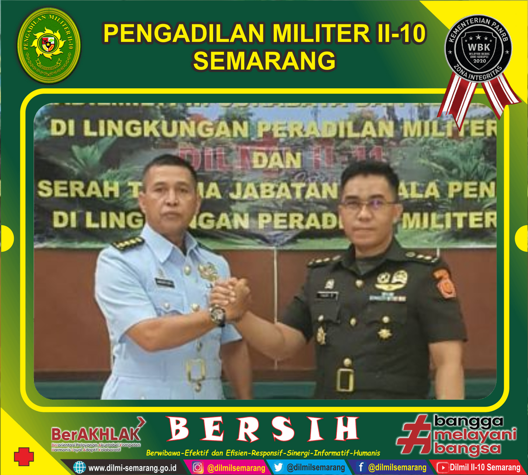 Semarang - Serah terima jabatan Kadilmil II-10 Semarang dari Kolonel Sus, Wahyupi, S.H., M.H. kepada Letkol Chk Yudi Pranoto Atmojo, S.H. dilaksanakan pada hari Kamis, 22 November di Pengadilan Militer II-11 Yogyakarta dalam acara Serah Terima Jabatan Kepala Pengadilan dalam Lingkungan Peradilan Militer.