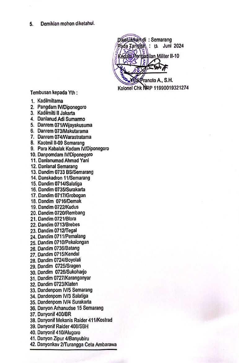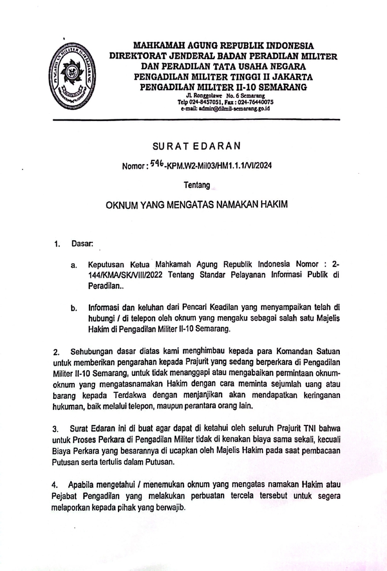 Surat Edaran Kadilmil II-10 Semarang tentang oknum-oknum yang mengatasnamakan Hakim/Pejabat Pengadilan Militer II-10 Semarang.