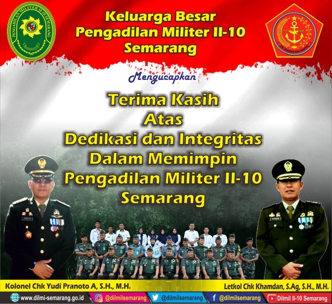 atas DEDIKASI dan INTEGRITAS dalam memimpin, menjadi guru dan sahabat selama bertugas di Pengadilan Militer II-10 Semarang. Semoga Perlindungan, kesehatan, kebahagiaan dan Kesuksesan Selalu untuk kita Semua, Aamiin Yaa Robbal' Aalamiin.